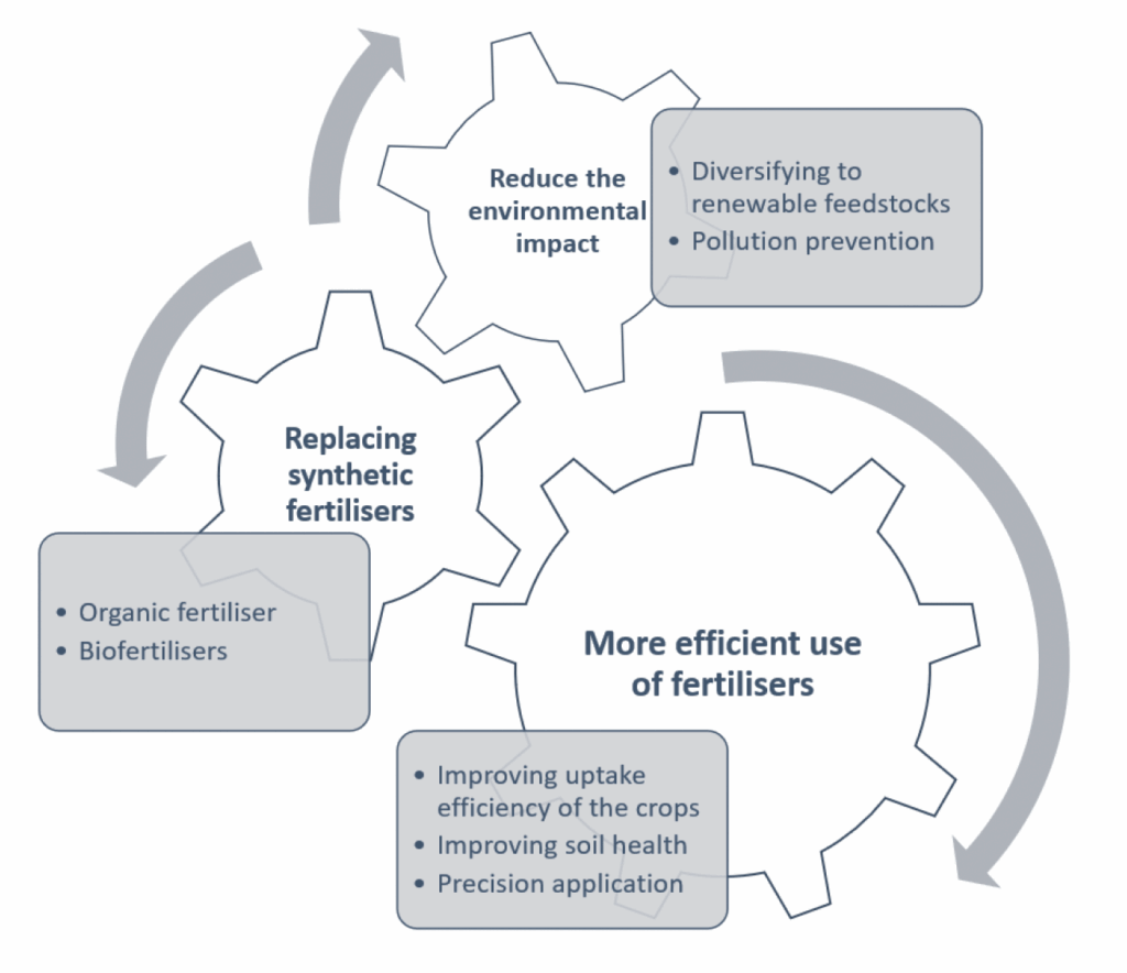 The use of synthetic and animal-based fertilisers is widespread throughout the UK and Europe. In addition, organic fertiliser usage, including the recycling of organic waste products and digestate biowastes, has been gaining increasing attention in recent years due to its net zero carbon emissions, significant soil health benefits as well as the increasing cost of synthetic mineral fertilisers. The proportion of agricultural fields across the UK and Europe that incorporate organic fertilisers is expected to increase in the future and this was included as a solution to reduce the impacts of fertiliser in a recent UK Parliamentary Office for Science and Technology note (see figure 1)