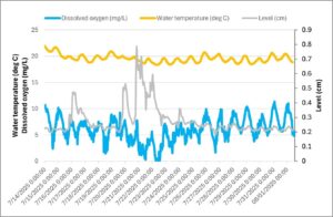 This project aims to enhance understanding of road runoff effects on river water quality (e.g. dissolved metals, plastics, organic load, thermal dynamics), aquatic biodiversity (e.g. algae, invertebrates) and ecosystem processes (e.g. organic matter cycling, ecosystem metabolism). A core area of study will be the River Aire catchment centred around Leeds (from Gargrave to Castleford), where water@leeds currently maintains a 25 sites sensor network (since late 2024) (link). The network currently focuses mainly on temperature and discharge measurement, and several sites also incorporate measurements of dissolved oxygen. Data collected to date highlights notable effects of storm runoff on river dynamics, notably severe oxygen sags following prolonged periods of low flow (Fig. 2).