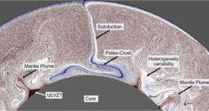 Ultra-Low Velocity Zones (ULVZs): ULVZs are thin (tens of kms) layers with strongly reduced seismic velocities and potentially increased density (Yu and Garnero, 2018). Their typical lateral extent is on the order of hundreds of kilometres and they are located at the core-mantle boundary. ULVZs are of unknown origin and both partial melt and compositional origins are discussed. ULVZs might have strong influence on core-mantle interactions and mantle plume stability and have been linked to the remains of the global magma ocean formed during Earth accretion. ULVZs can be imaged using waveform analysis.