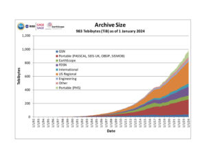 | Figure 1: Increase of data held by the Incorporated Research Institutions for Seismology as of January 1, 2024. Different data sources are color coded with both permanent and temporary installation being included. Source: EarthScope Data Statistics (https://ds.iris.edu/data/distribution/) |