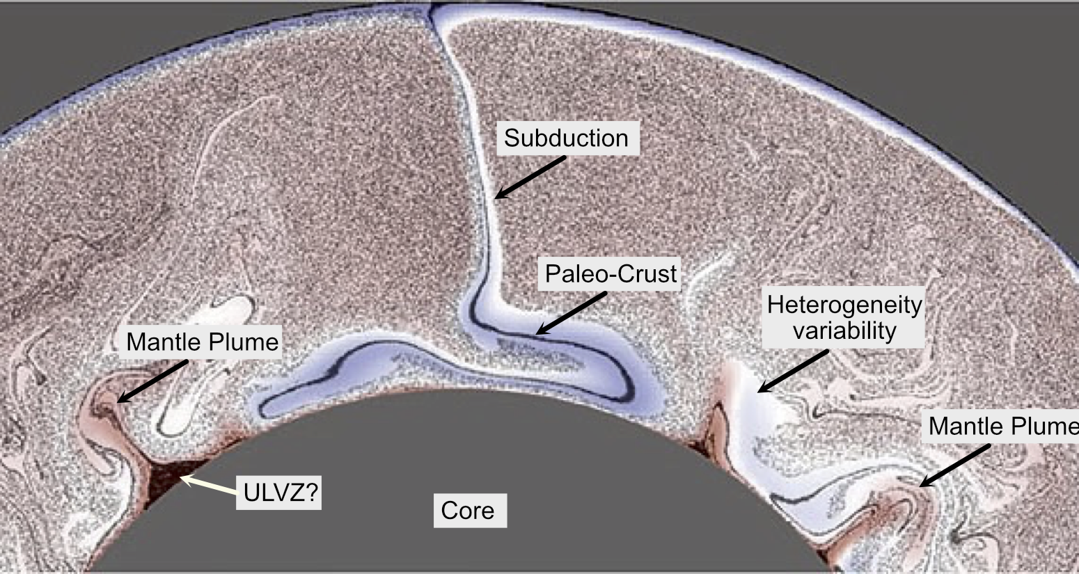 Mantle mixing products: Geochemical evidence shows that subducted crust and lithospheric material is mixed back into the ambient mantle (Figure 2). The details of this mixing are ill-understood as is the scale of heterogeneities throughout the mantle although there is evidence that they are close to the seismic wavelength of the high-frequency seismic wavefield. This small-scale heterogeneity can be imaged using the scattered seismic wavefield (Shearer 2015).